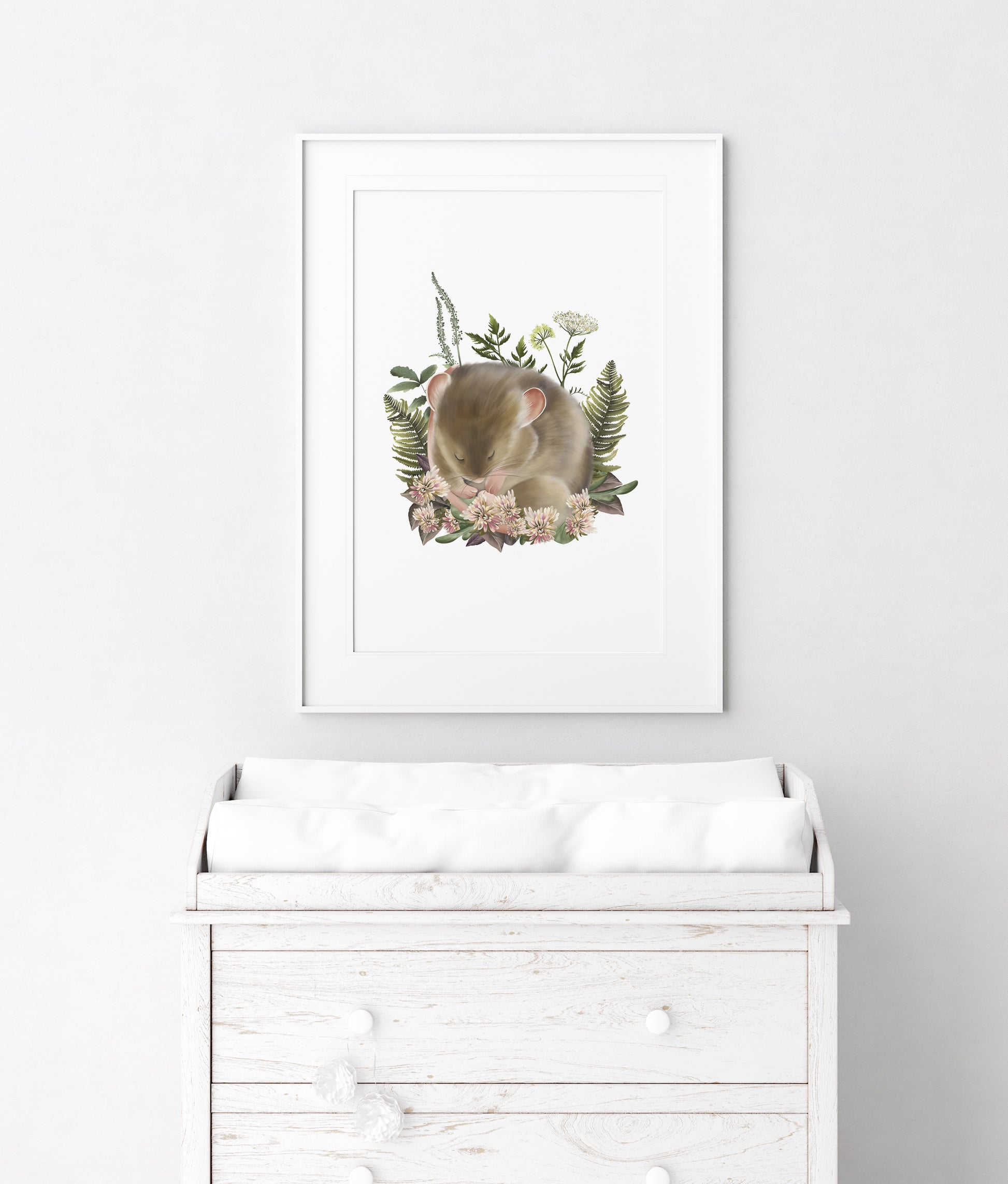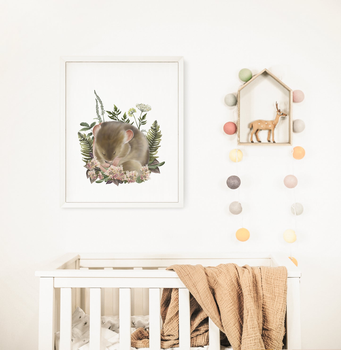 This little baby mouse sits in a bed of clover and woodland foliage. From my original artwork for my Into the Bramble Collection, this little bear is part of a set featuring all kinds of woodland and forest creatures inspired by my childhood growing up in the English countryside. He makes a perfect gift for your favorite little person or put him in the nursery or playroom and let your little one make a new friend!